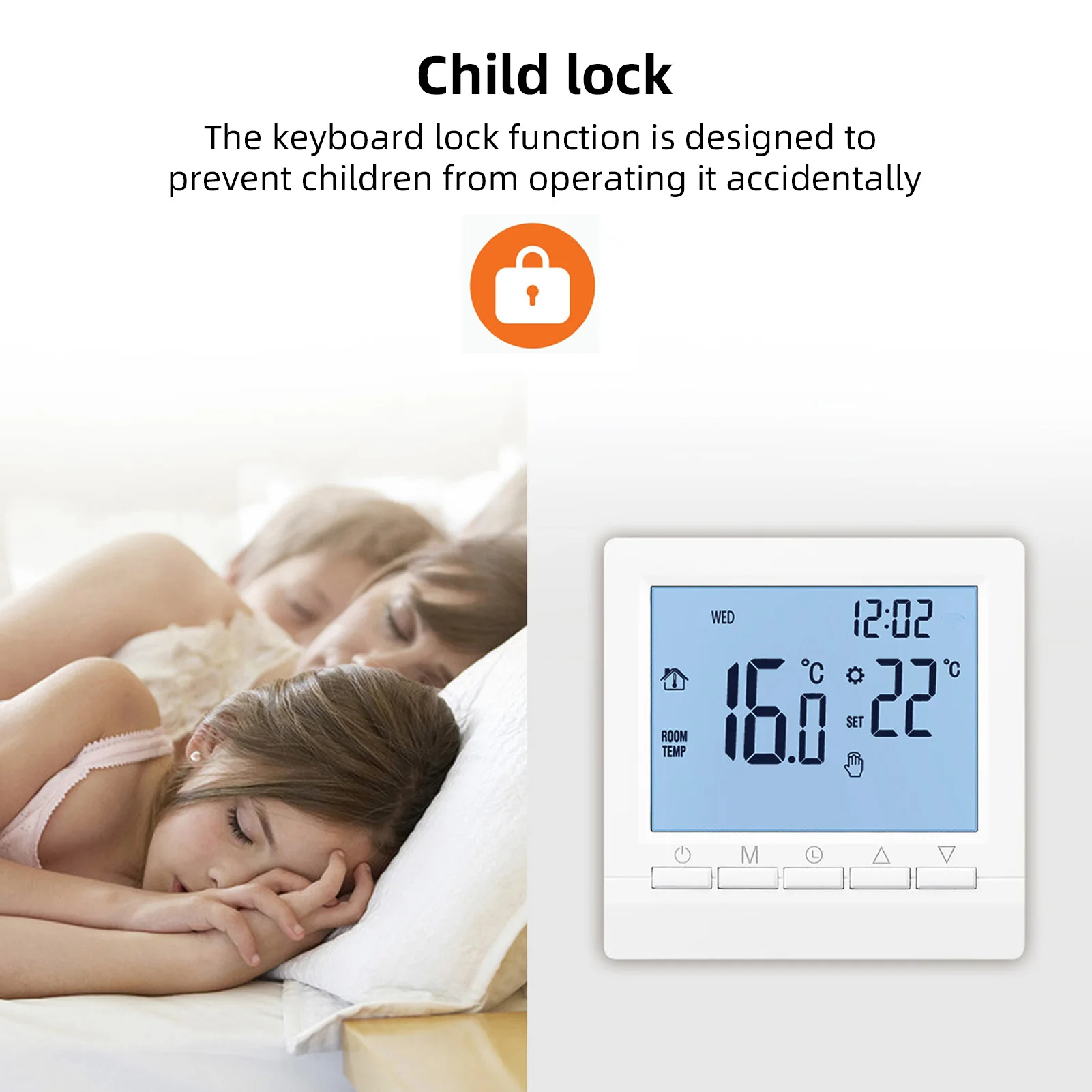 4. 【Safety Protection】Smart thermostat with child lock and low temperature protection. Effectively prevents children from operating it by mistake. When the indoor temperature is lower than 5℃, the thermostat automatically turns on the heating. When the indoor temperature rises to 7℃, the thermostat automatically turns off the heating.